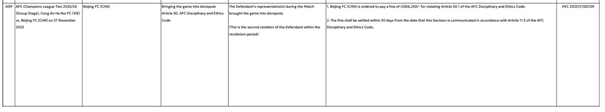 亚足联官方默示,北京国安与河内公安的算作毁伤了赛事声誉。(此为两边在累犯期内的第二次违法)北京国安足球俱乐部(中国)、河内公安足球俱乐部(越南) 因违抗《亚足联递次与谈德准则》第50.1条,被处以6250好意思元罚金。